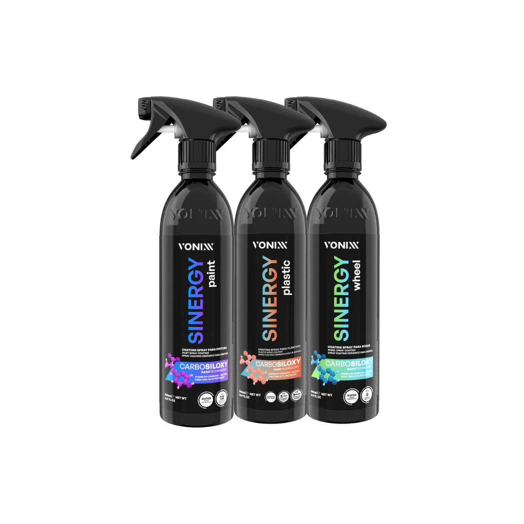 Sinergy es un revestimiento en spray de fácil aplicación desarrollado para la pintura de automóviles y su función es proteger la pintura hasta por 12 meses. El diferencial de este producto es su tecnología exclusiva de Vonixx, CARBOSILOXY, donde el elemento químico carbono actúa en sinergia con el silicio y así forma una película resistente y súper hidrofóbica y tiene un tiempo de curado más corto, en promedio 60 minutos. Además, este producto reduce la fricción, minimizando los rayones y promoviendo un excelente brillo.